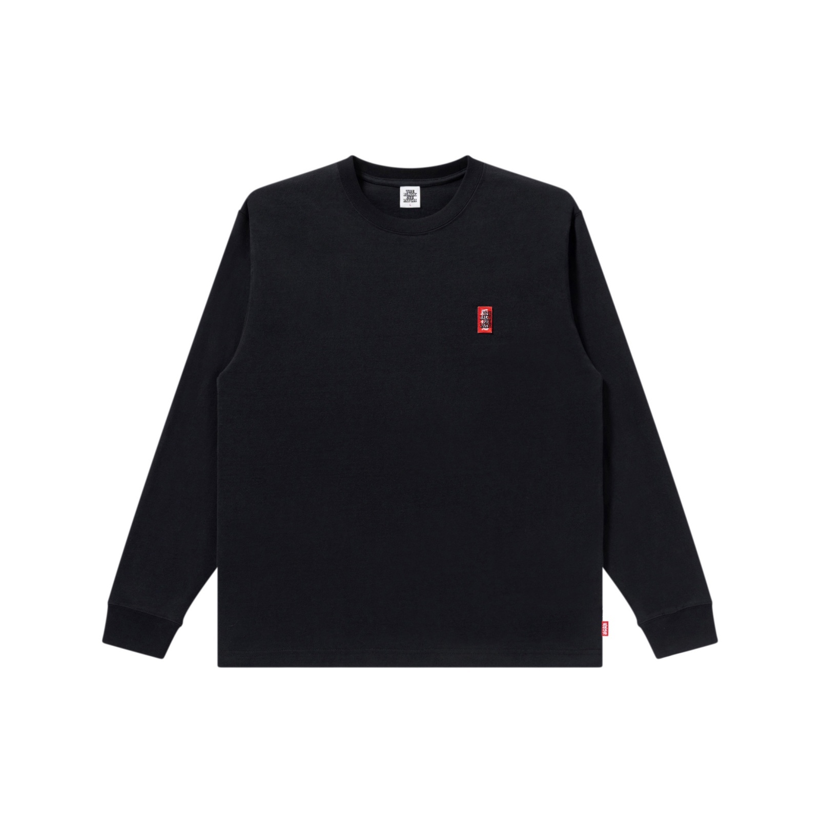 左胸に "取扱注意" LABEL ロゴグラフィックのスモールワッペンを配置したロングスリーブ T シャツ。