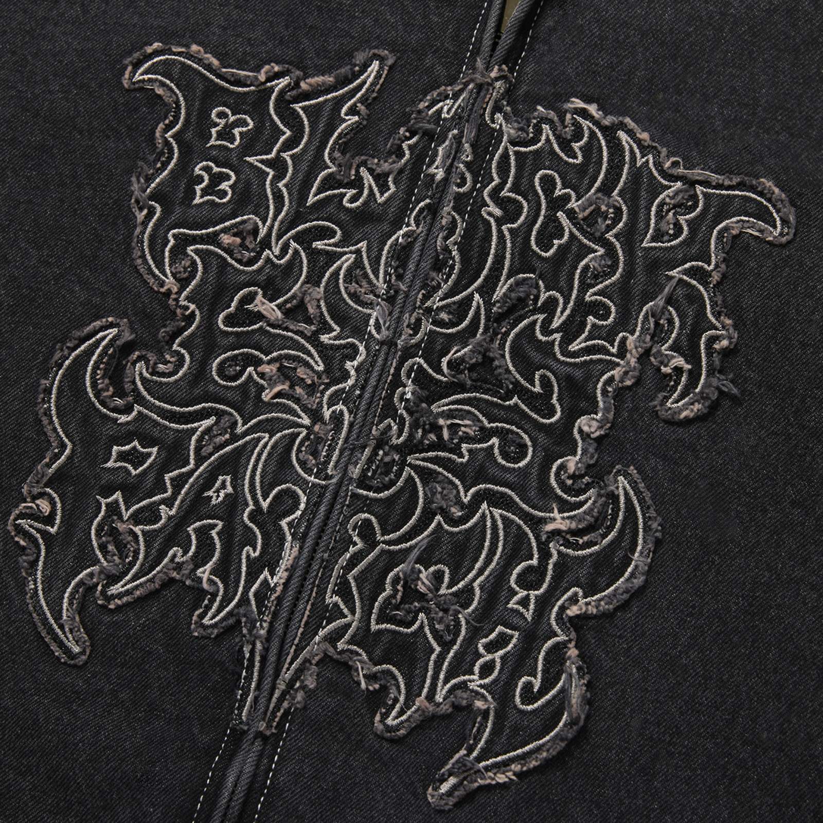 ブランドネームをデスメタルバンド調のグラフィックに仕上げ、ボディと共地のデニム地のアップリケを叩きつけている。