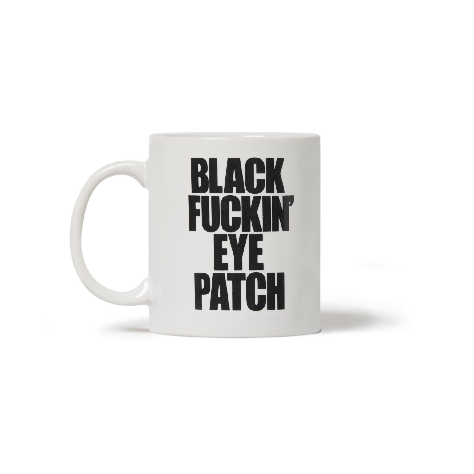 "BLACK FUCKIN’ EYE PATCH" のグラフィックをプリントしたマグカップ。