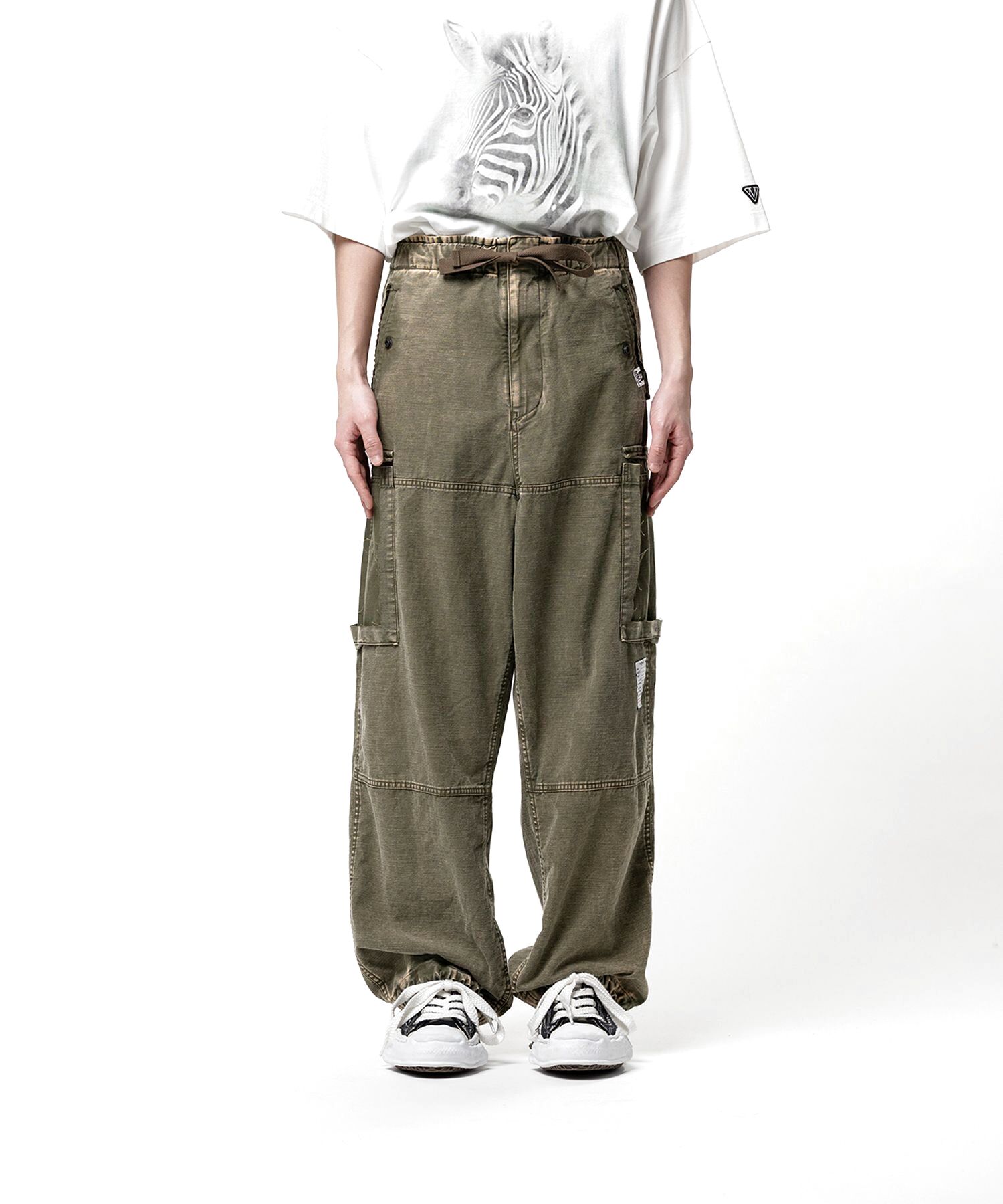 ヴィンテージ加工が施されたコットンサテン生地のカーゴパンツ。