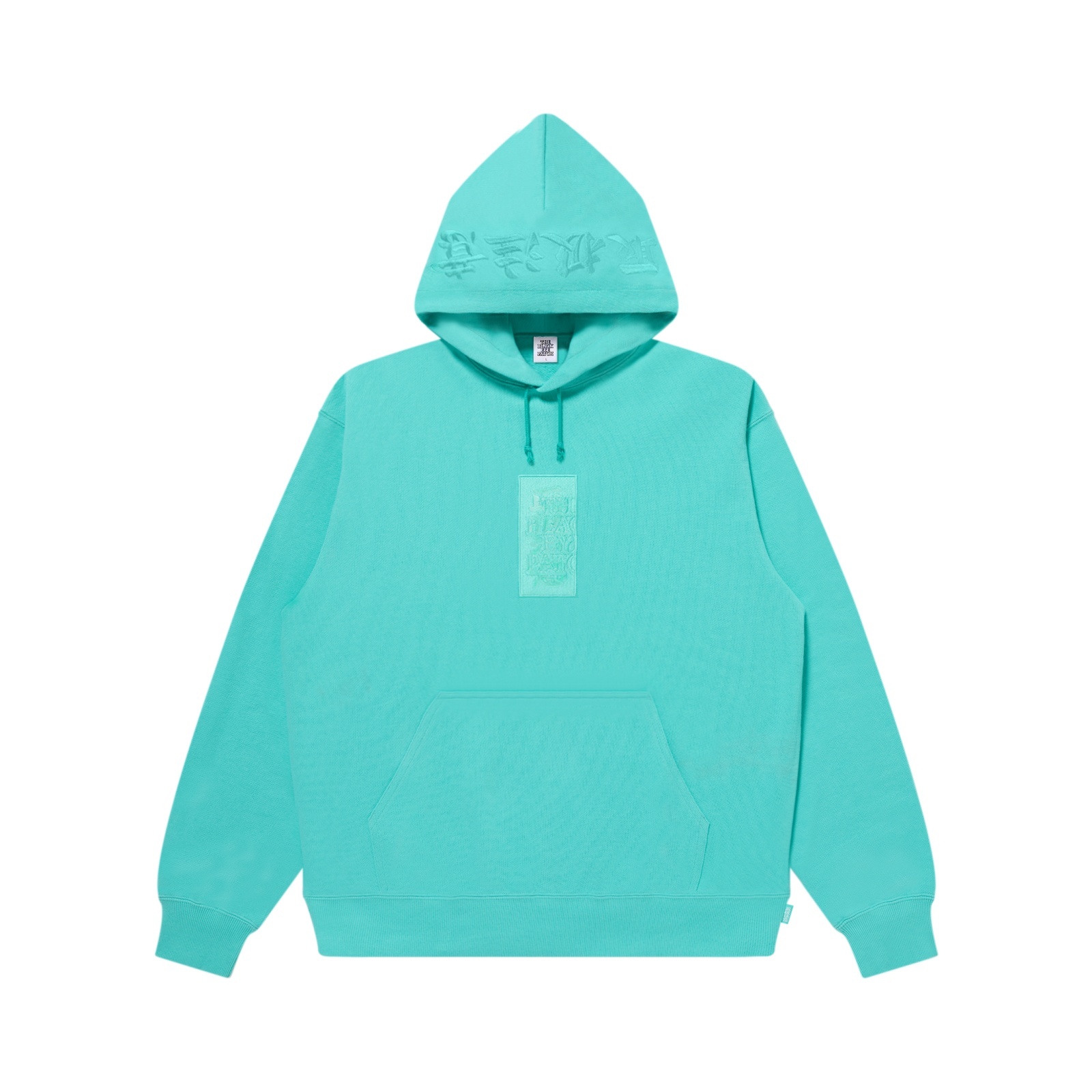 "取扱注意" LABEL のグラフィックをボディと同系色で表現し刺繍で施したプルオーバーフーディー。